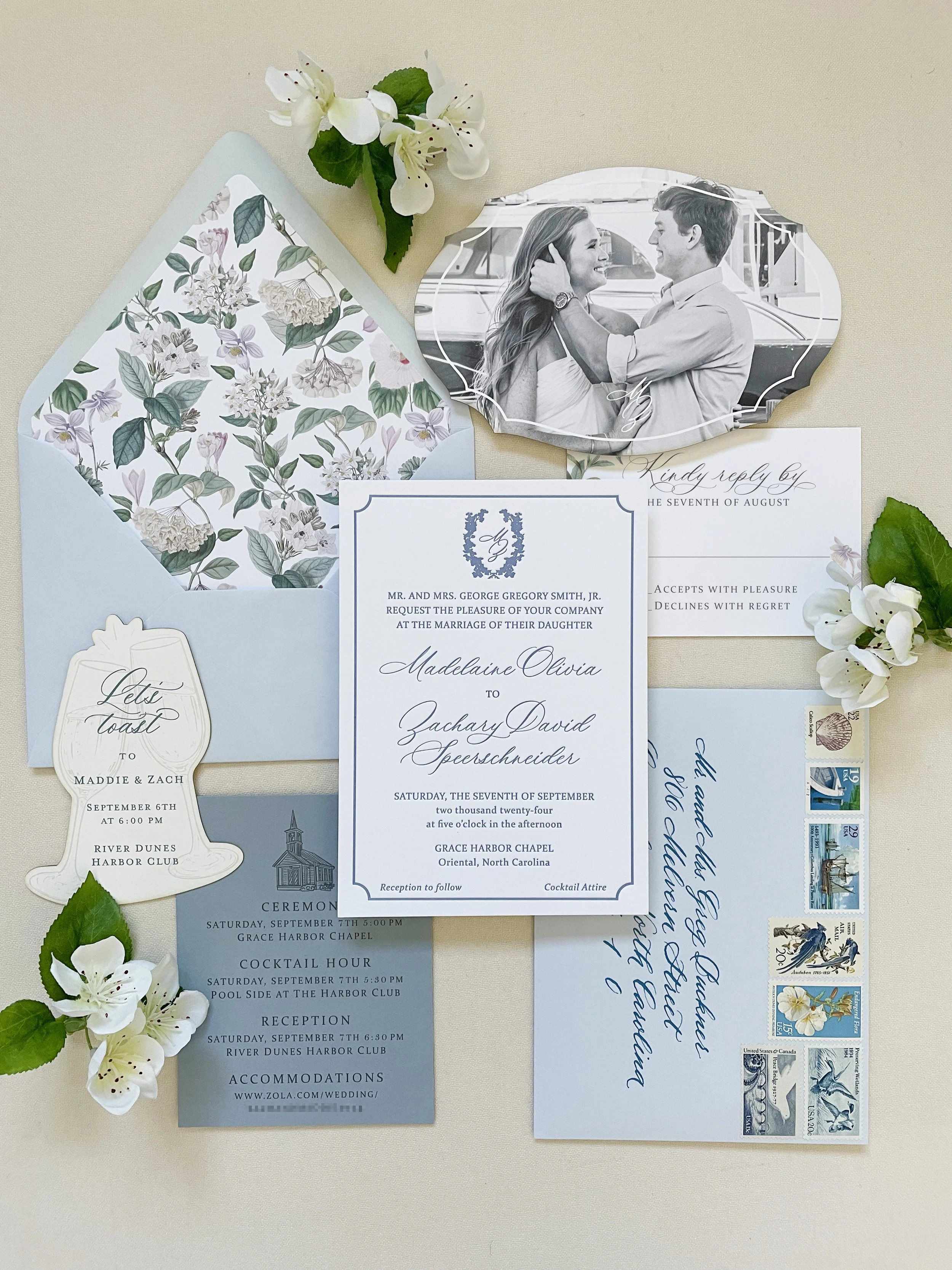 Your wedding stationery sets the tone for your entire celebration. We design beautiful, custom suites that feel as unique and timeless as your love story — from the very first save the date to the final thank you card.